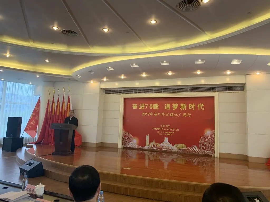 广西壮族自治区党委统战部部务会成员、新闻发言人邓国忠在启动仪式上致辞,他首先对海外华文媒体高层莅临广西表示欢迎,希望今后加强与海外华文媒体的合作,助推广西自贸区的发展。